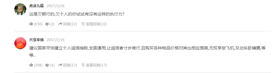 排名第二,获得398点赞量的网友评论是这样说的:“建议国家尽快建立个人诚信指数。全国通用,让诚信者寸步难行,且购买各种物品价格对其也相应提高,无权享受飞机,及动车卧铺票,等等......”看得出众多网民都期待国家出台相关政策,对老赖进行严厉地打击!